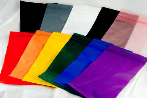 Recloseable poly baggies in a variety of colors, internal size is approximately 4"x6" (10.2cm x 15.2cm).