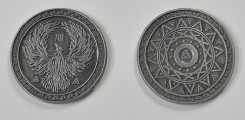The Silver coins measure 30mm x 2.5mm. All coins are struck from high quality zinc, electroplated with colored nickel and coated with an antique finish. Our coins look, feel and even sound as if they've come directly out of a fantasy realm!