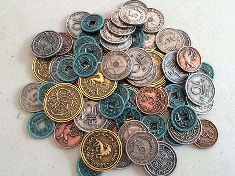 80-Piece Set of Custom Metal Coins, perfect for Scythe™ by Stonemaier Games, or for many other games that would look and feel great with high-quality metal money!